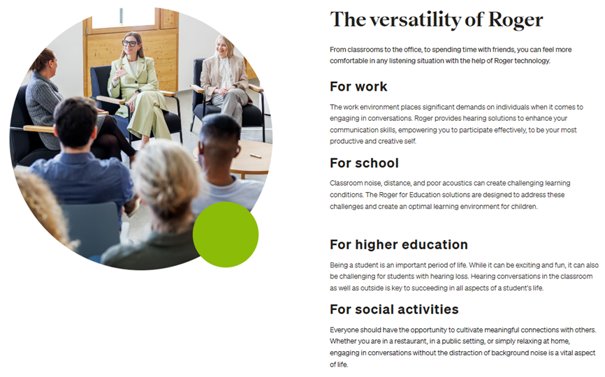 Roger is an intelligent wireless technology that transmits speech directly to hearing aids and cochlear implants, helping to overcome distance and noise. Functioning like a third ear, Roger microphones allow people with hearing loss to learn, work and socialize more easily -- a big step towards more inclusive societies and greater personal well-being.